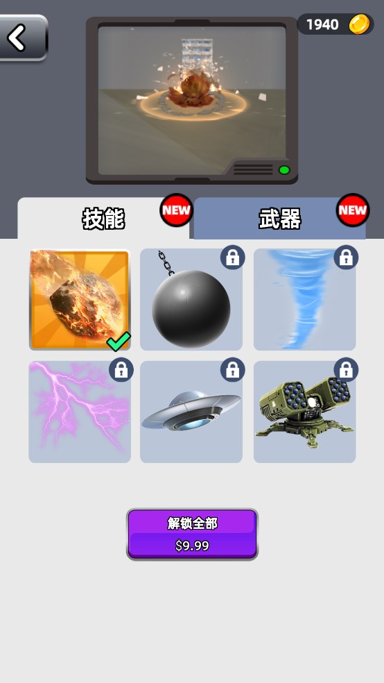 7、积累到一定的金币后,觉得现有武器不够给力,炸不动了,可以解锁新的更强的武器