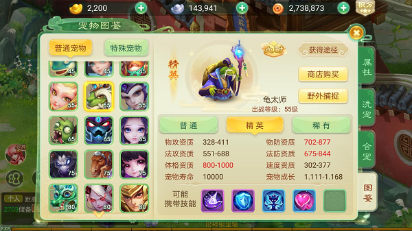 关于龟速宠的选择,龟太师目前来说是各等级阶段通用的首选龟速宠物,养成条件符合速度资质慢,成长以及三围属性高便可进行养成合宠(精英宠的资质),极端的情况下还能选择卡低等级追求最龟的速度,没有最龟,只有更龟说的就是这个玩法