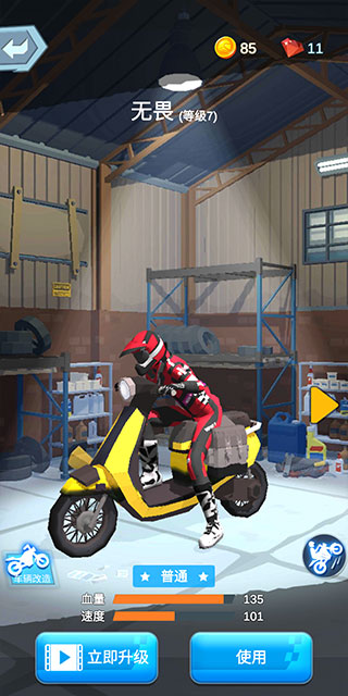 2、通过左右滑动屏幕即可开始竞速游戏,当金币以及钻石达到一定数量时即可点击下方升级我们的武器或者车辆