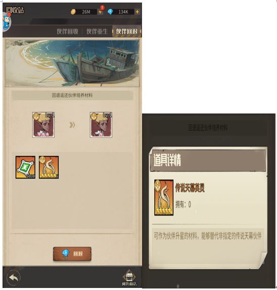 对于某些粗心的冒险家前期升级错误的伙伴不需要担心,可以点击伙伴左上角的回退按钮,是有伙伴重生和伙伴回退功能的。伙伴重生可以返还伙伴培养对应等级的材料。