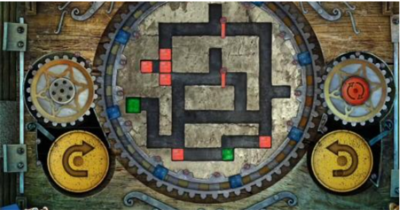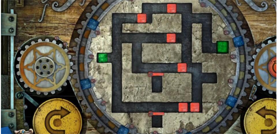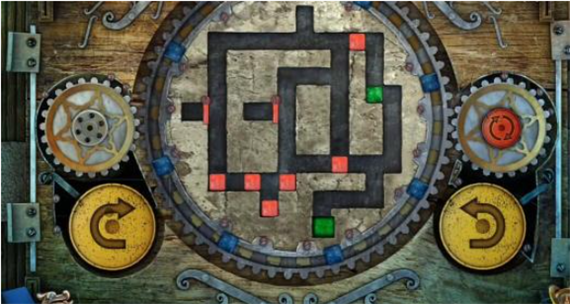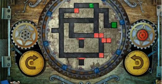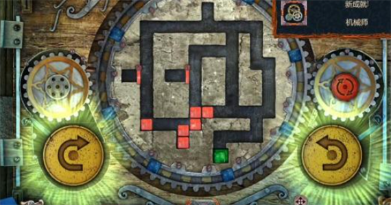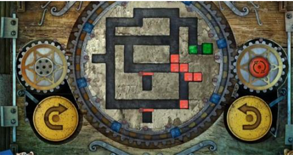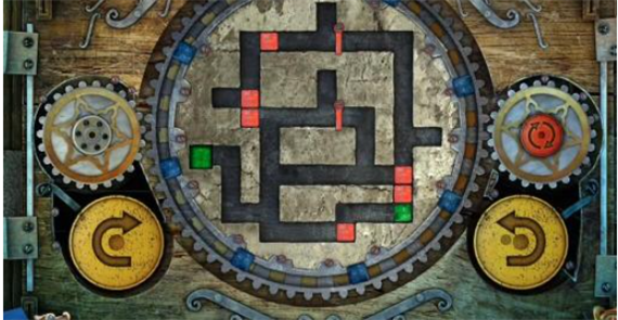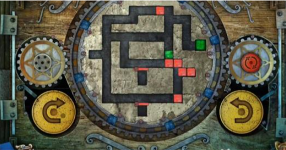 17、最后,点击左边黄色的旋转按钮一下,中间的大齿轮会顺时针旋转一次,旋转后的立方体位置如图,此时的绿色立方体已经进入了绿色的单元格内,即可通关,门就打开了。