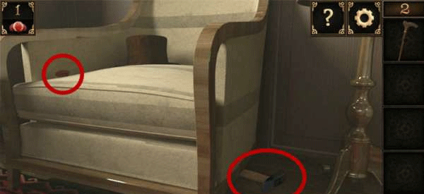 2、收集左边沙发上面的红色宝石,捡起地上的锤子。