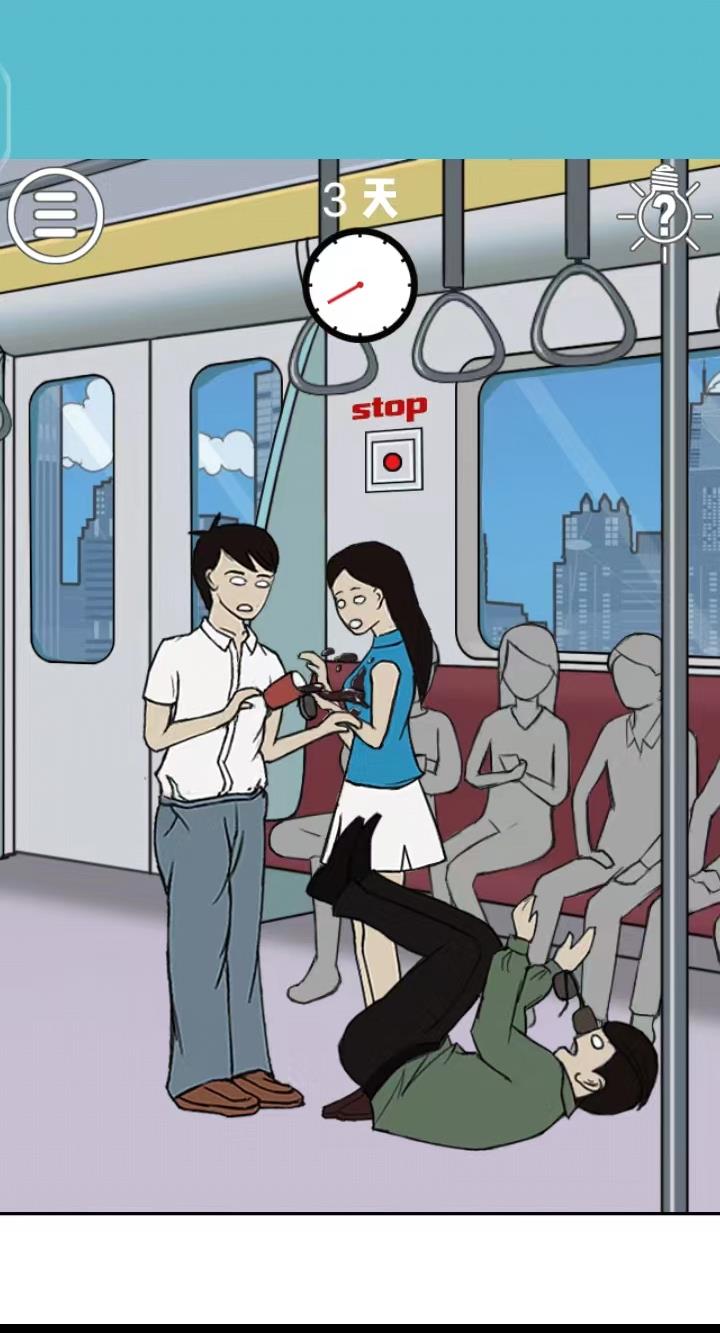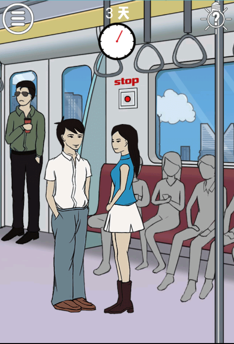 9、这一关先点击绿色衣服手上的饮料,再点击绿色衣服的男生,然后将绿色衣服男生拖动到女生的旁边,将饮料给白色衣服的男生,然后再点击画面中的【stop】红色按钮,即可通关;
