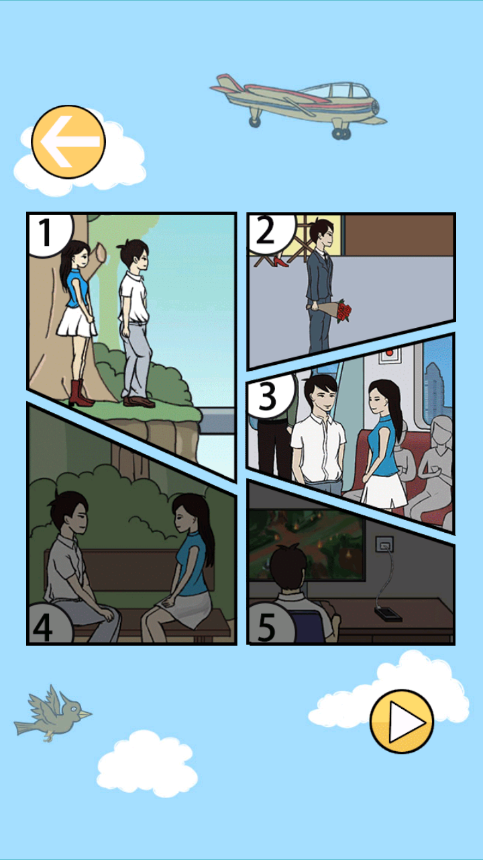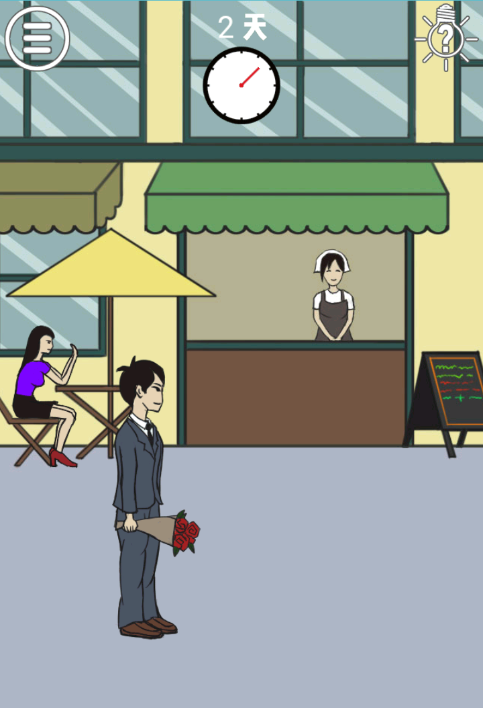 7、点击上图的紫色衣服的女生和男生手上的鲜花,然后将女生拖动到男生旁边,并将鲜花给美女,即可通关;