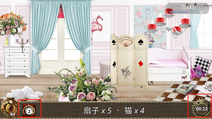 1、首先,玩家在本站下载并安装好游戏之后,打开进入,玩家将扮演爱丽丝,在画面中寻找相应的物品;下图左边的按钮可以预览物品的样子,方便玩家更快地进行寻找,而右边的按钮可以帮你找到找个物品,但是这个按钮是有冷却时间的哦~