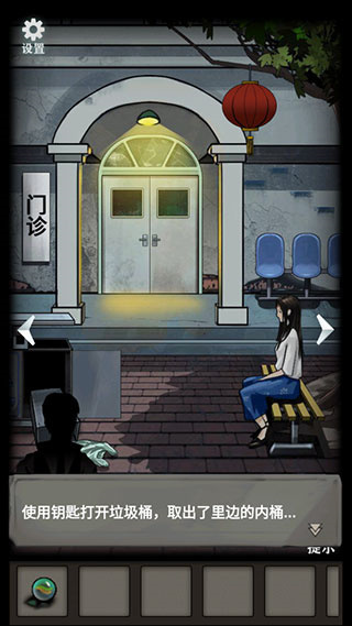 6、然后顺利进入精神病院,但是依旧有门锁进不去,环顾四周,在花坛获得弹珠,到院子墙上的环卫工衣服里找到钥匙。