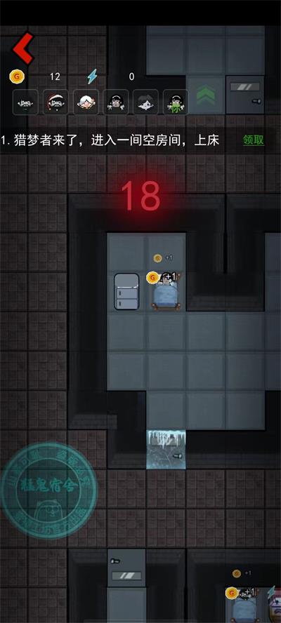 4、进入游戏之后,玩家要在倒计时结束前找一个没人的房间,根据游戏中绿色的指示进入房间(记得关上大门),然后躺在床上睡觉,可以不断获得金币;当然完成任务也可以领取金币,比如说升级床,大门以及建造建筑物;