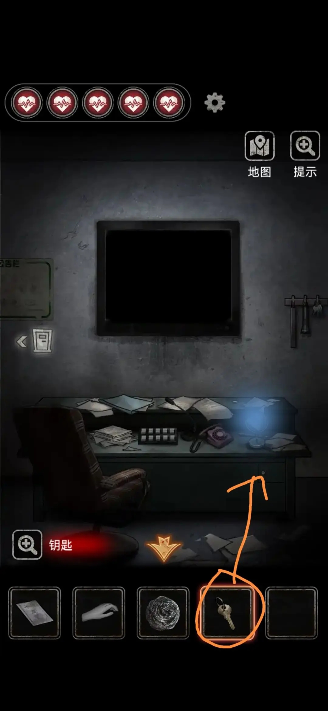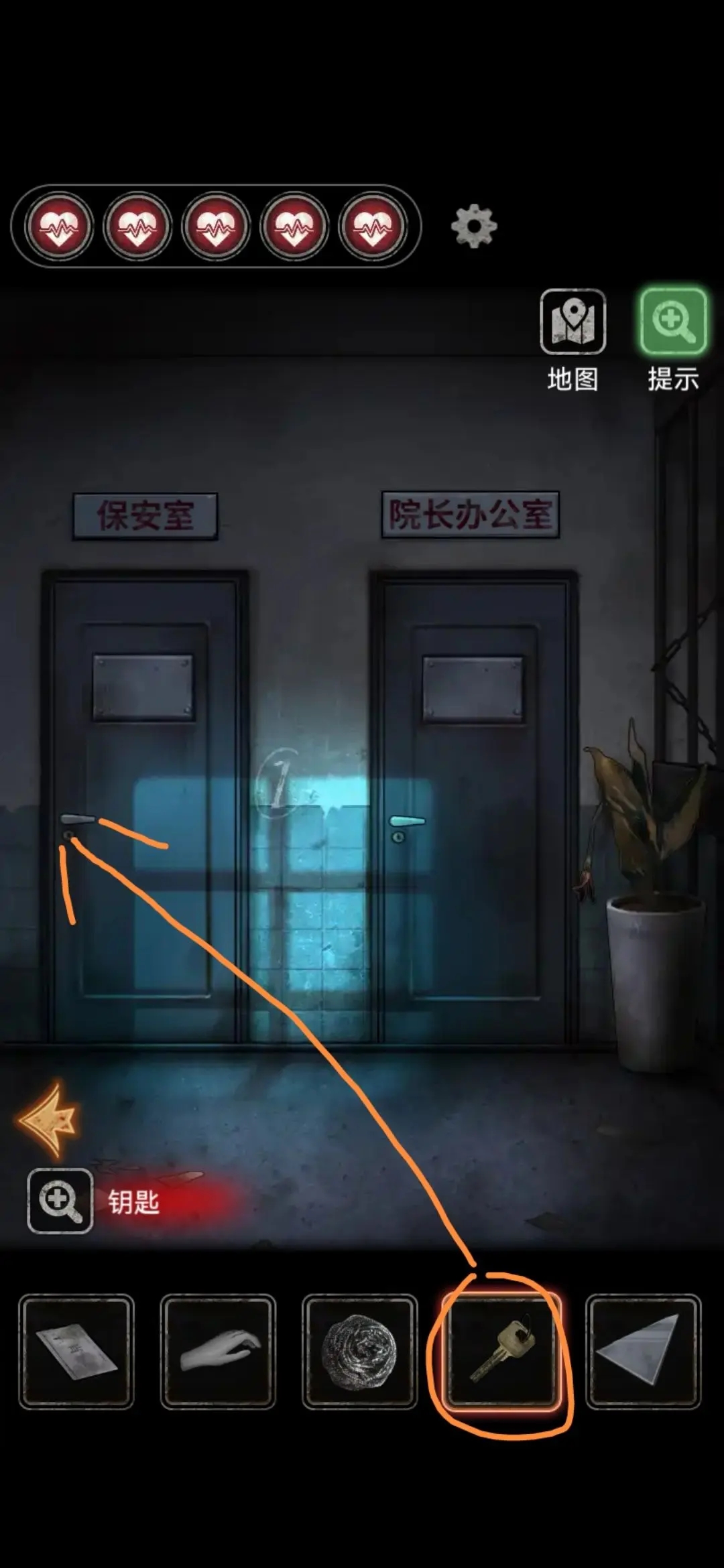 回到检查室,点击开关拉出,用镜子碎片划破布袋得到钥匙