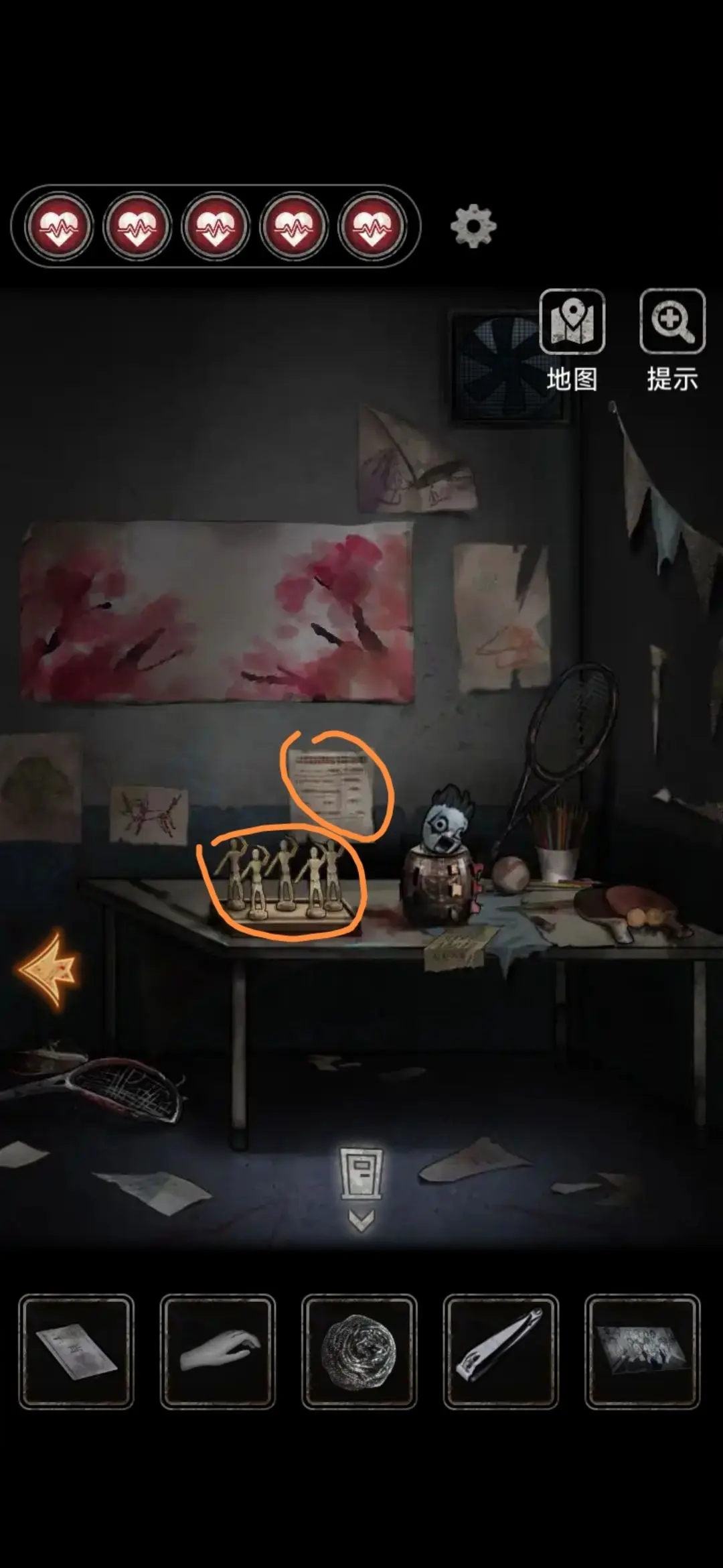剥开小人得到说明书,用使用指甲剪得到拳套,插上电源插头启动跑步机得到蓝色小人头,用拳套击打沙袋得到橙色小人头