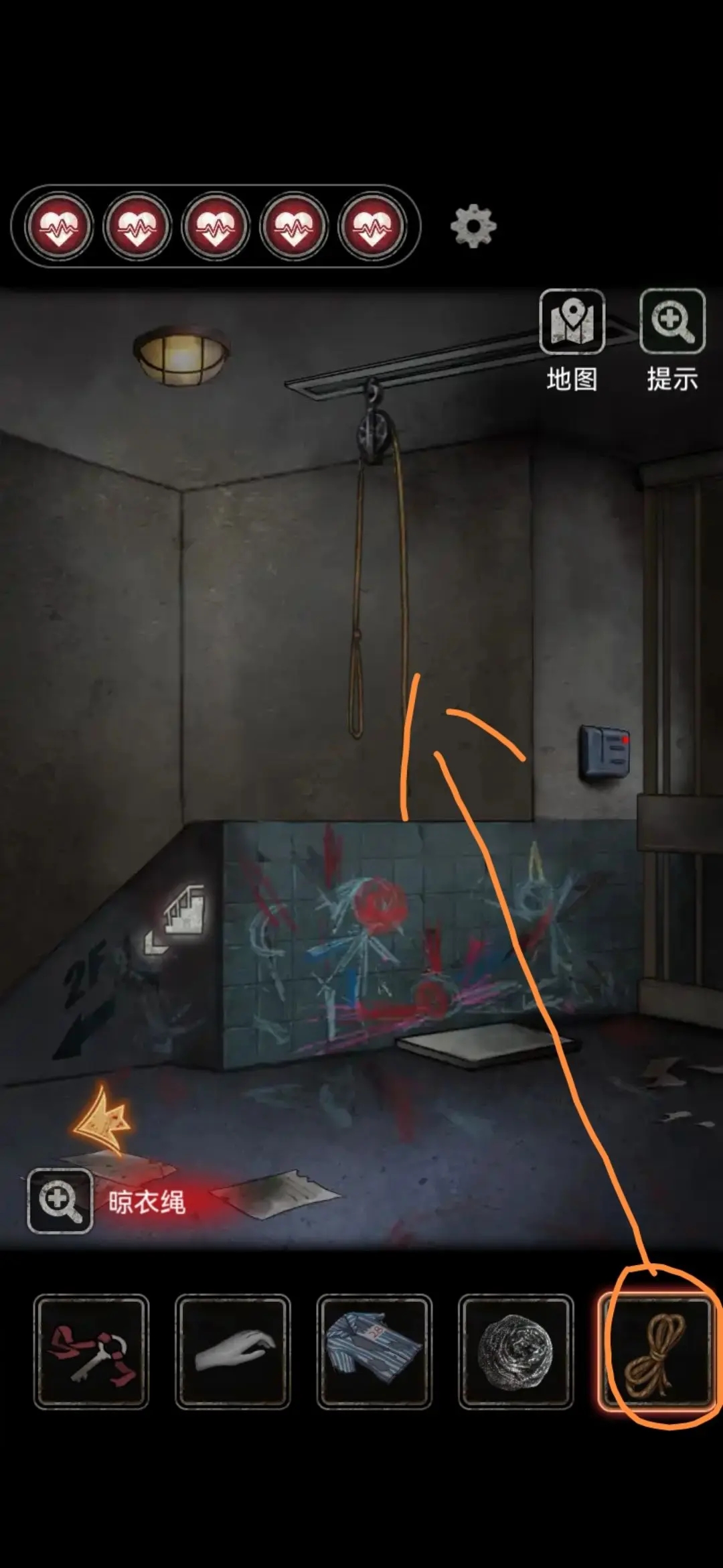 把DIE输入到浴室大密码箱中解锁得到保安室钥匙,绳子,资料册,在浴室外地板上得到绳子