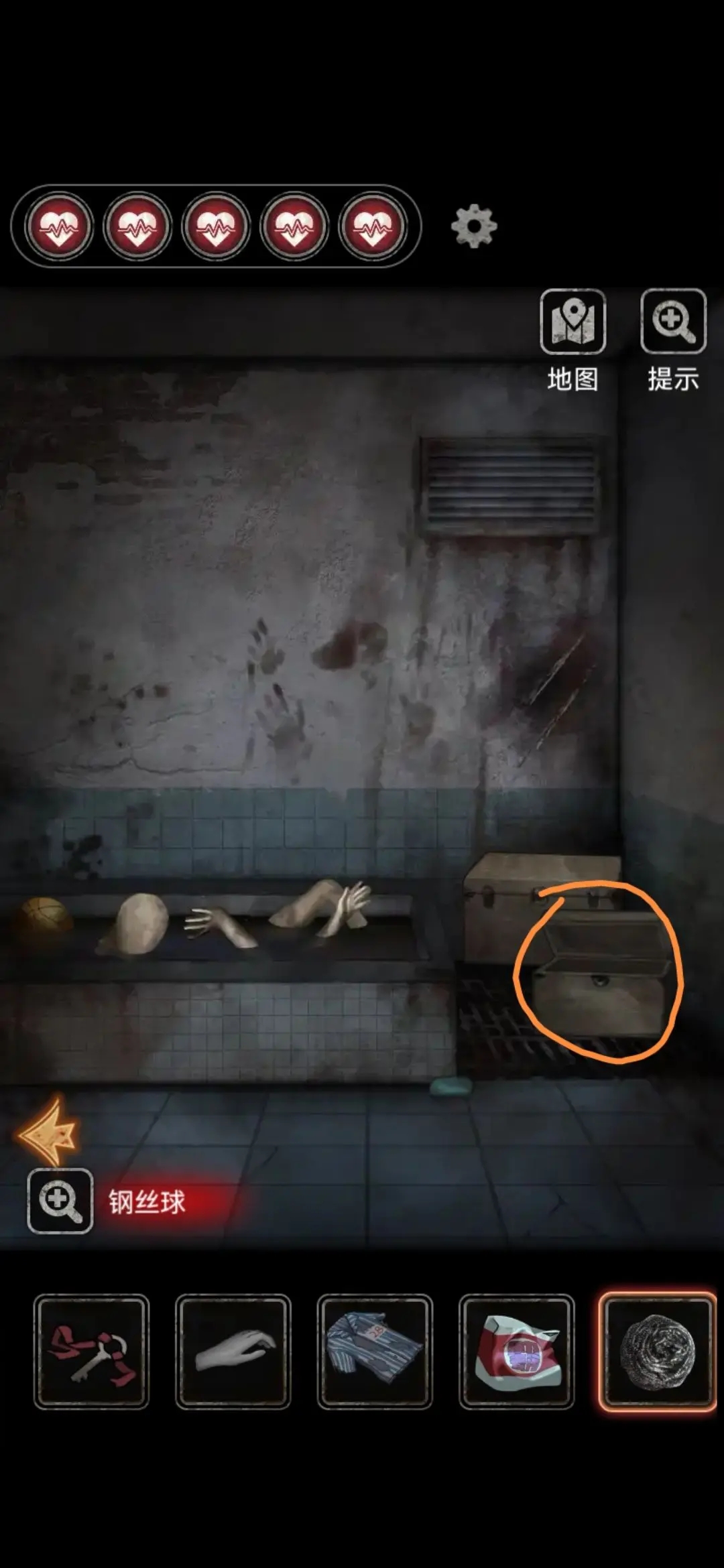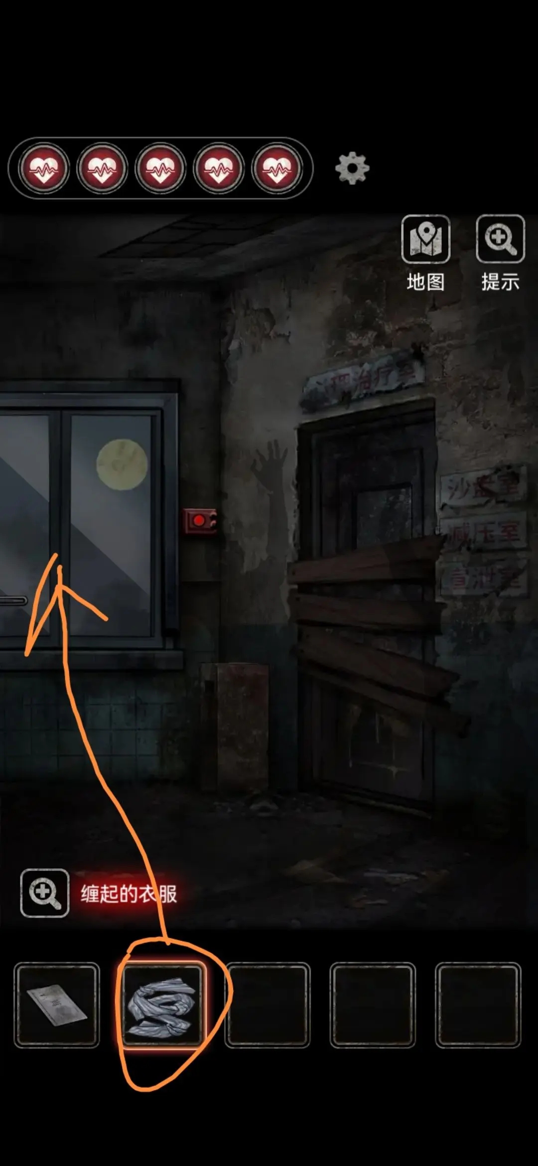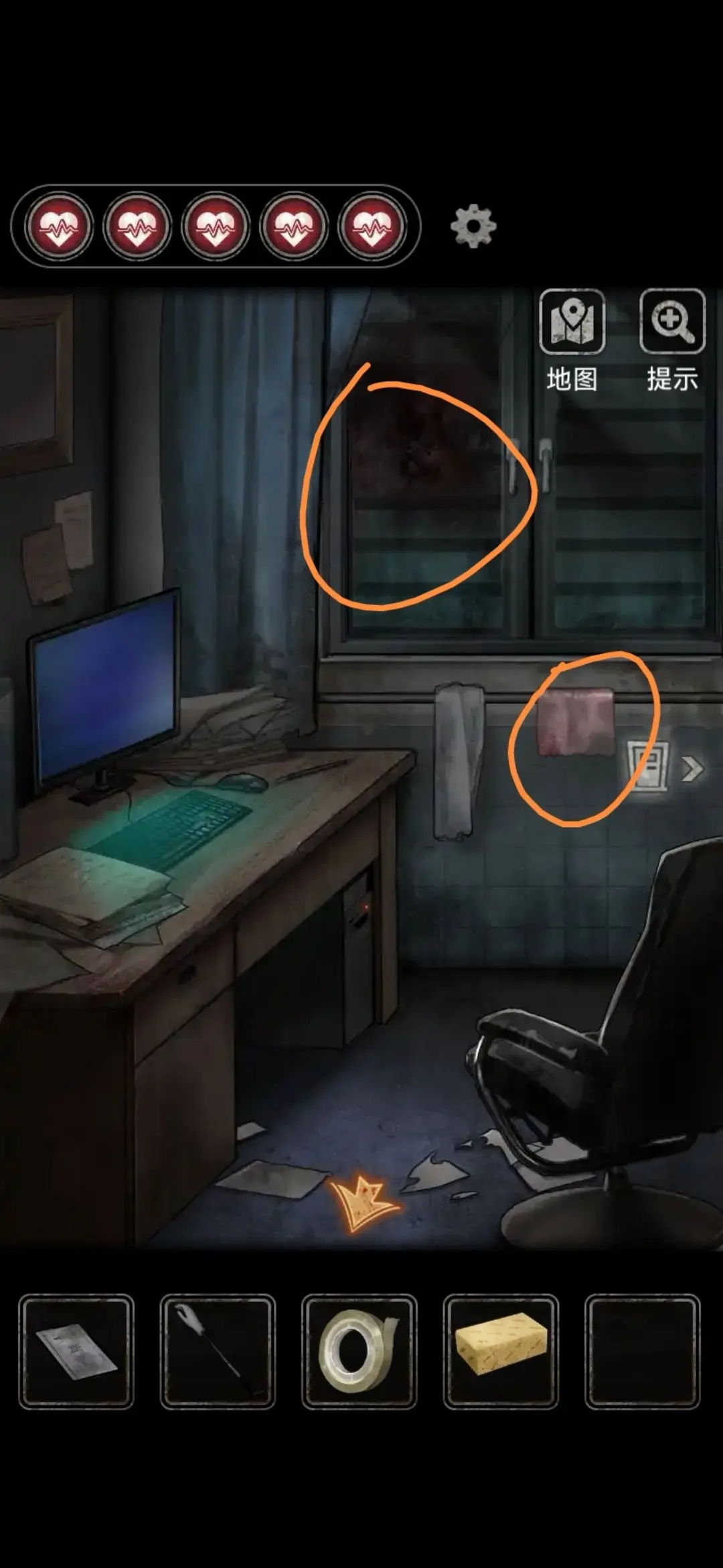 点击图中位置拿到抹布,用玻璃球堵住管道后放满水,海绵和抹布放入浸湿,用假手拐杖和抹布组合擦干玻璃上污渍,得到提示密码:5823