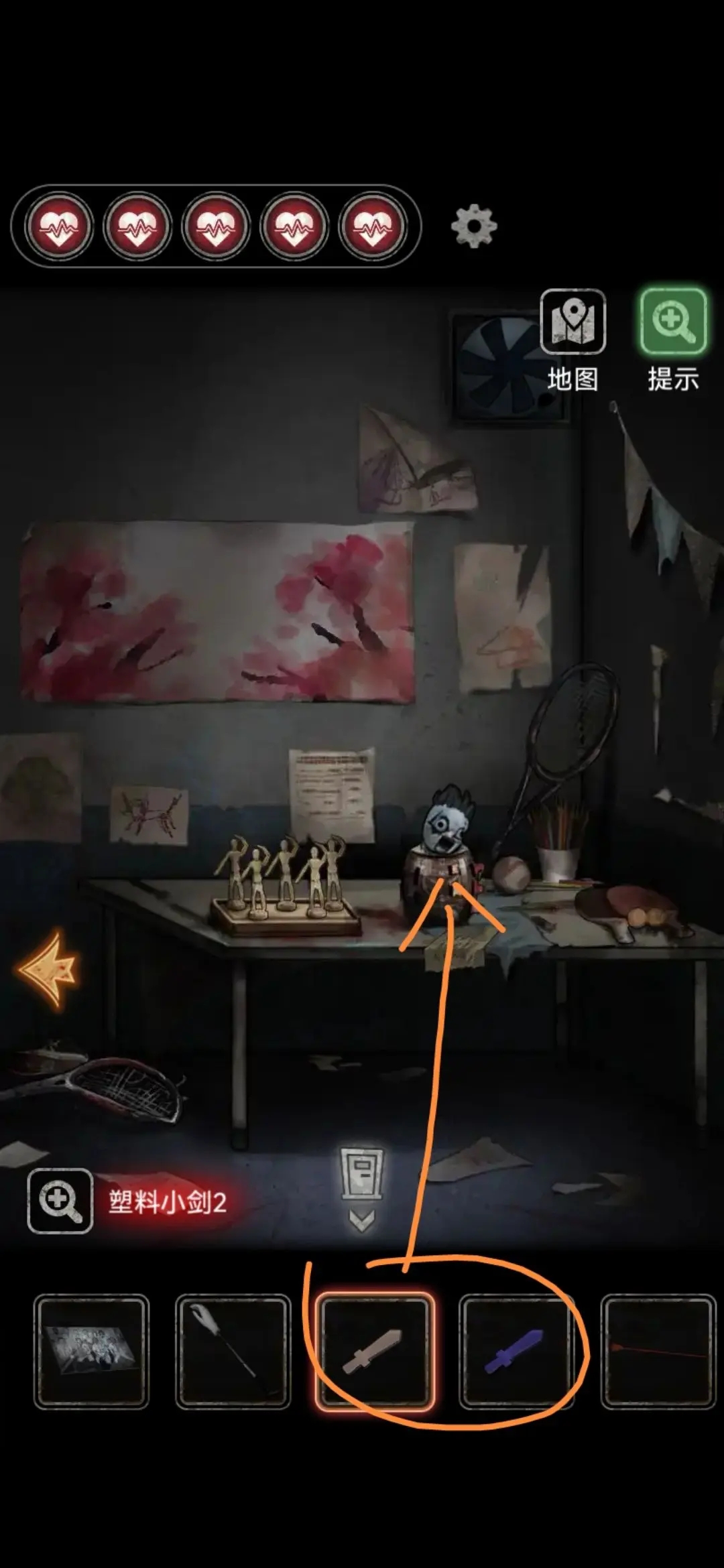 点击右上角打开排风扇,用钢丝球堵住风扇,拿痒痒挠勾出第三把塑料小剑