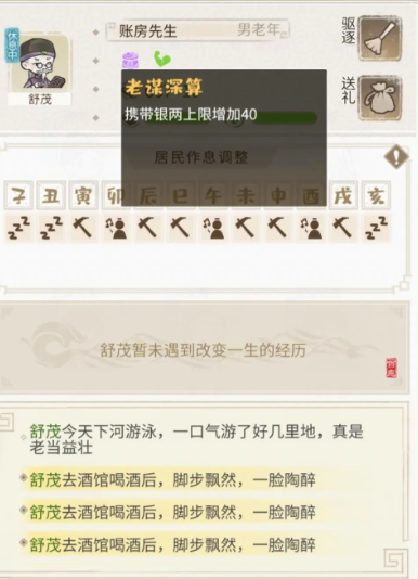 账房先生酒馆商行都能上,不过最主要功能就是酒馆。账房的能力直接提高酒单价,大概7点1块钱。所以加能力的书可以送账房最划算。实际不过是浪费送礼次数。