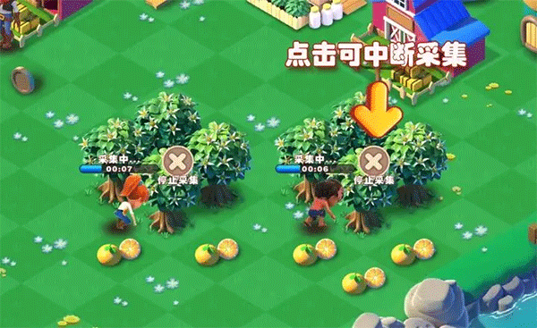 进入游戏后默认是不会打开持续采集的,但是在玩家第一次采集后就能看到开启持续采集的提示。开启后选择一个可采集的物品点击采集,居民就会过去持续采集。点击居民采集进度条旁边的叉则可以取消当前采集。