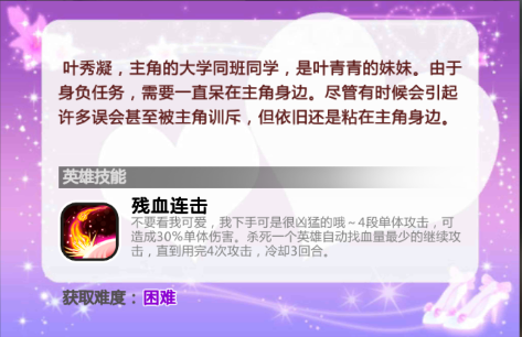 虽然叶青青不是在前期免费获取,但她是可以通过首充获取的,前期应该有十分之一的玩家持有她,所以她应该可以划分到新手英雄之中。虽然是A级英雄,却有着S级的输出,唯一可以在前期压住龙哥的人,灵星之前得到老师,都可以无条件培养,灵星之后才抽到老师,也可以慢慢培养。大招核心主输出已及范围附属输出的模式使她无论是在主线副本打单体,还是在礼物大作战-女神试炼打群体都有统治级的输出。限制她的评级的是她的基础攻速和生命值,使得在PVP时比较难以取得先手,杀青几乎成了双方第一战略目标,一个残血青青在PVP劣势局翻盘是常有之事。