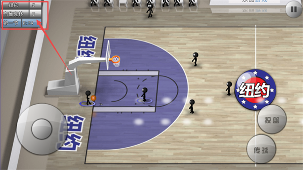 火柴人篮球赛每一节比赛都是以跳球的形式开球的。当教练把球抛起来的时候,玩家按下红色圆圈标示的按钮,就能跳起来抢球。