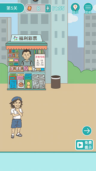 第五关:打翻场景的垃圾桶得到月光宝盒,前往场景二点石头得到时针,将时针放置在钟表上,控制时间到月亮出现,此时将月光宝盒放置在石头的石槽中,等待片刻,捡取五元硬币,回到场景一购买便可获得大奖好礼