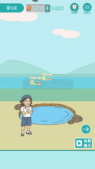 第三关:前往场景二的帐篷后面得到斧头,将斧头丢进场景一的水池中,然后在白胡子老头出现后,点击腰间别着的斧头即可