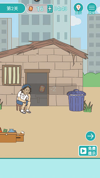 第二关:点击场景一中的工具箱,得到刷子,然后前往场景二,将刷子放到红漆桶染色,再回到场景一,将房子画上拆迁的标志即可