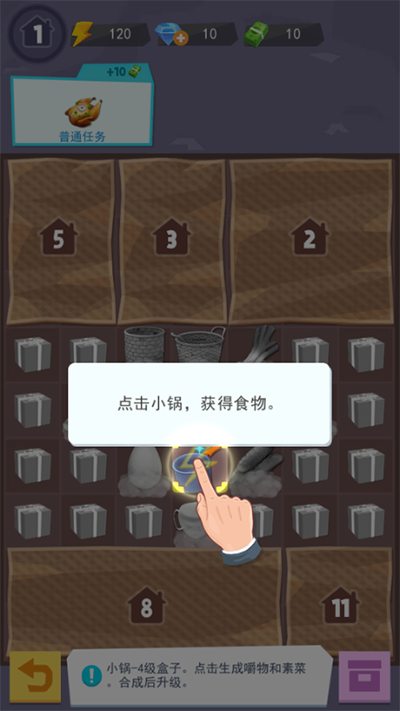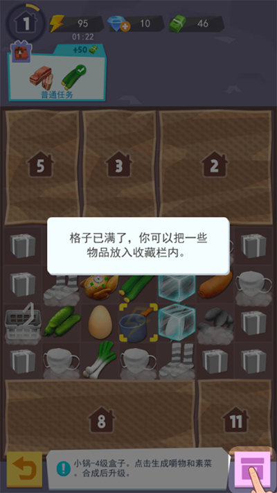 2、进入到主线任务点击效果获取食物,将食物手机到任务食物框里,还可以将同样的食物进行合成更高级的食物;