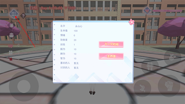 2、点击左侧第一个标志,可查看人物具体信息,返回主界面或进入下一个时间