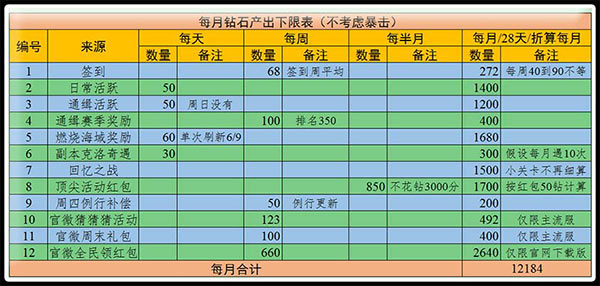 从表中我们可以看到,玩家A每月可以获得的钻石在12000左右。而且这里的计算都相对保守,实际产出一般还会比这个数字更高一些。