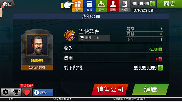 3、建立自己的卡车车队、购买车库、雇佣司机、管理您的公司,以获取最大利润。