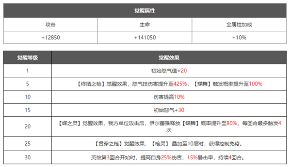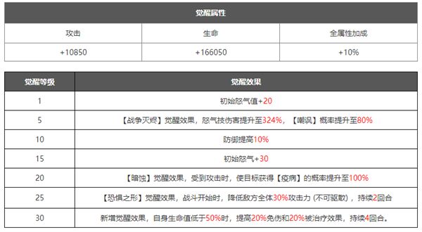 在角色培养到十星之后可以解锁觉醒界面,可以理解为花费资源升级觉醒等级,然后解锁更加强力的技能。觉醒技能一般是在原有技能的基础上进行数值的增加,或者新增各种增益/减益效果,大部分都是被动技能,解锁之后能大幅提升角色的战斗力。