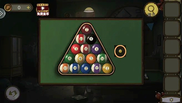 13、根据教堂墙上、牌子上、柜子上、音响上的线索,摆好台球拿到【黄色按钮】。