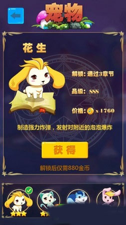 游戏里有好多可爱的宠物角色,比如花生、小麦这些经典动漫里的小可爱,陪你一起闯关,感觉特别有趣。而且每个宠物还有专属技能,关键时刻能帮大忙!游戏打破了传统的泡泡龙模式,玩法更新颖,还加入了各种道具和魔仙技能,可以自由搭配使用,增加了不少策略性。