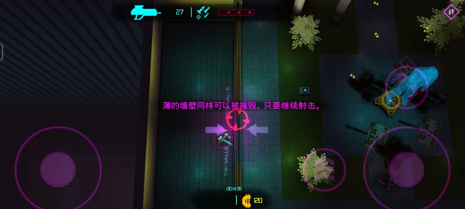 这个游戏叫朋克大暴走中文版,又名Neon Chrome,是个无限双摇杆自上而下的射击游戏,风格很赛博朋克,紫色和蓝色为主调,加上极简设计的图标和高科技建筑,感觉特别未来科幻。玩法挺简单的,就是一层层扫荡敌人,消灭所有威胁。游戏里有很多武器可选,每把都有特殊效果,还能利用地形掩护自己,但所有东西都能被摧毁,包括墙,这样既方便攻击也能增加危险性。