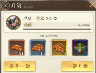 等级:提升角色等级需要消耗牛角面包来获取经验值,经验条满了之后就能够提升等级了,等级上限受冒险等级限制,每次等级提升之后都能够让角色获得基础属性提升,该过程对于面包的消耗量非常的大,在前期提升等级的时候一定不要挥霍。