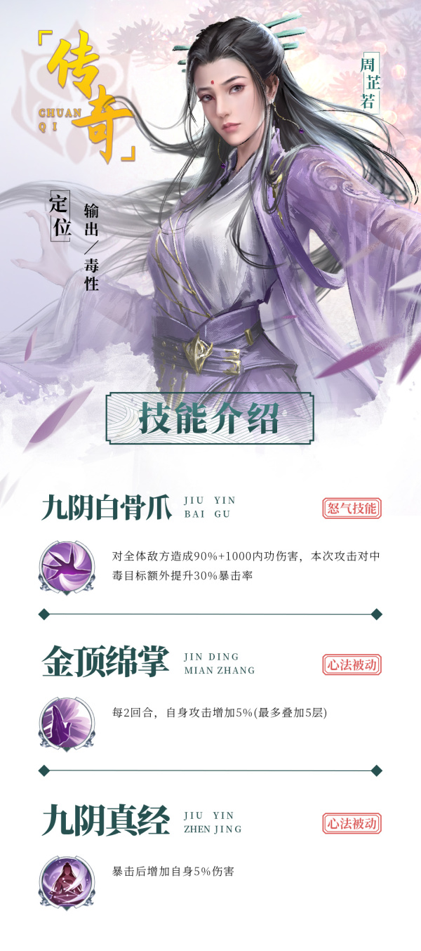 生平:周芷若幼时父亲周子旺(修订版、新修版改为汉水船夫之女,可能是考虑到老灭绝怎么会收留她所痛恨的明教教徒后人才进行了修改)遭元兵杀害,遇张三丰相救,与少年张无忌在汉水舟中邂逅,并对张无忌有喂饭之恩,后被送至峨嵋派。成年之后与张无忌重逢互生爱慕并立有婚约,为完师父灭绝师太遗命“光复汉家河山,光大峨嵋”取倚天剑、屠龙刀,后杀害张无忌表妹殷离(实际未死)并嫁祸蒙古朝廷爱慕张无忌的赵敏。成婚之际赵敏以谢逊毛发相胁使得婚礼生变,周芷若遂与张无忌决裂,回到峨嵋专心习武,一心完成师父遗愿光大峨嵋。屠狮大会,张无忌念情相让,周芷若以九阴真经上的武功赢得“武功天下第一”的称号并与张无忌并肩攻打少林金刚伏魔圈,为灭口欲杀害谢逊被杨龙后人黄衫女子所阻,最终与张无忌立下约定飘然洒脱而去。