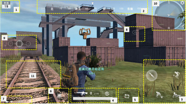 小地图显示区域,点击小地图可以查看放大版的小地图。 右上角为“设置”,点击可以呼出设置界面,进行操作模式的选择等。 右下角为“奔跑”,点击进入奔跑状态,但新的移动,射击,下蹲等操作会打断这个奔跑状态。 奔跑状态用于玩家需要长距离奔跑时,便有玩家操作。 11、虚拟摇杆-人物移动