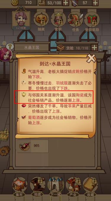 平民崛起记是一款轻松休闲的文字类模拟经营游戏,游戏中玩家将从一个平民开始,你需要游历于各大城镇岛屿之中,从最初的市井小民开始一步步走向致富道路。游戏玩法也很简单,用你敏锐的眼光关注市场的动态,合理的把控物价的涨幅规律,最终以低买高卖的方式不断从中赚取收益。当你足够有钱的时候,就可以购置农庄,酒庄,商队,歌舞厅等等,然后每一回合都能给你增加固定的收入,让您手中有粮,心不慌。同时,游戏中还加入了许多事件系统,例如前面一位老人摔倒了,你会不会去扶起来?国王邀请你去皇宫谈一谈?你要不要去,去了又会有怎么样的结果?大大增加了游戏的可玩性。