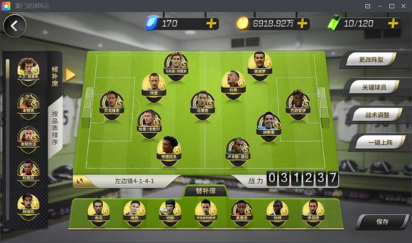 目前这个阵容也不是完全体,右后卫有个A卡的阿兹皮里在培养(平民体力是个大问题啊)准备换夸德拉多,还有托蒂、纳斯里、卢卡斯3人混在其中,有贝格维奇、托蒂、巴舒雅伊3人一转,其他都是没转的,可以看出其实就这个阵容来说可提升空间还是很大的。BUFF有领袖、冲锋;后卫有盯人可有效阻止对手跳水;进攻手段有托蒂远射、纳斯里佩德罗跳水、巴舒雅伊头球、接贝格维奇长传的凌空(其实头球进球率实在太低,这个希望有所改进),特别点评一下贝格维奇,这个门员不止守门还助攻,一场起码发动2次,巴舒雅伊虽然没有凌空可是有个冲击波,配合起来还是很好使的。