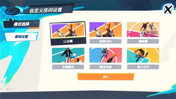 目前自定义房间中除了常规的【11分赛】、【经典3V3】、【巅峰赛】、【王朝模式】等,还有三种特殊模式分别是【结对作战】、【单人斗牛】以及【篮板房】。所有模式均可邀请好友,或者选择与电脑作战。此外,自定义房间中的比赛成绩不会计入排名。