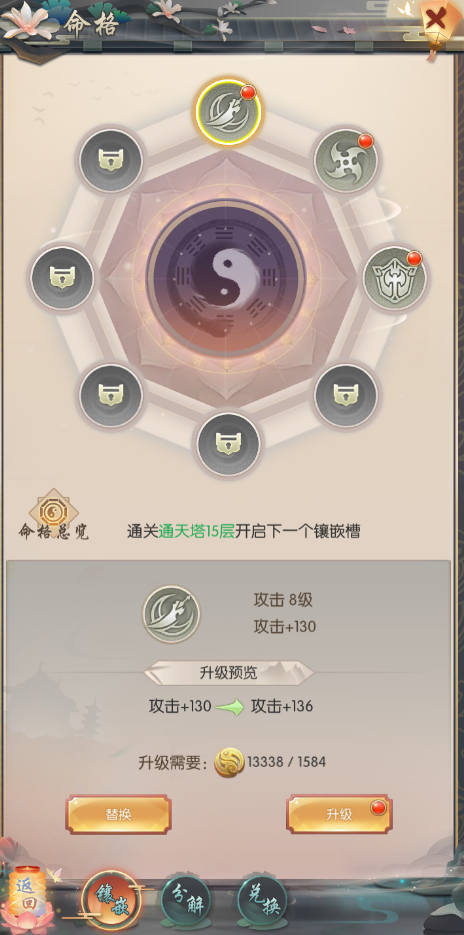 1、通关【通天塔】玩法可开放更多的命格镶嵌槽位以及命格;