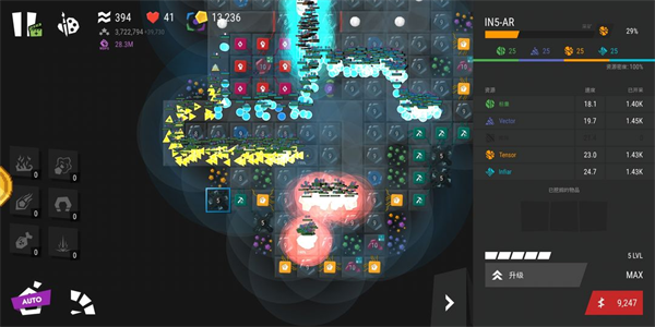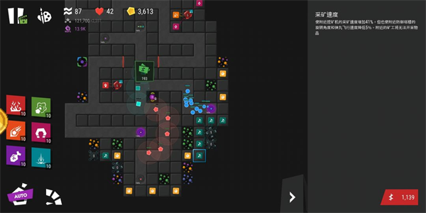 当芯片放完,我们的重心就放在两个方面了,养矿机和防御。矿机的培养顺序是先给纯青矿旁边放3个挖矿芯片,然后纯矿1级,再在周围的其他两个补2个挖矿芯片,合计五个,接下来在不漏怪的前提下把青矿机升到5级,科技最大采矿速度53.5/分这样我们就保底获得了321青矿每分的收益了。