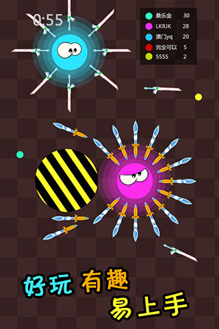 《刀剑英雄大作战》是一款以飞刀为主题的多人竞技小游戏,玩法类似于《球球大作战》。玩家需要控制一个小球,在地图上收集各种刀剑来强化自己,同时躲避或击败其他玩家。游戏规则简单,操作轻松,随时可以切换攻击和防御模式,提升战斗力。