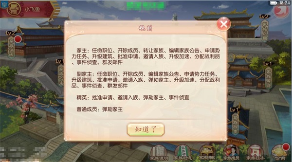 创建家族者即为家主,可任命副家主两名、精英3名。每种职位的权限如下: