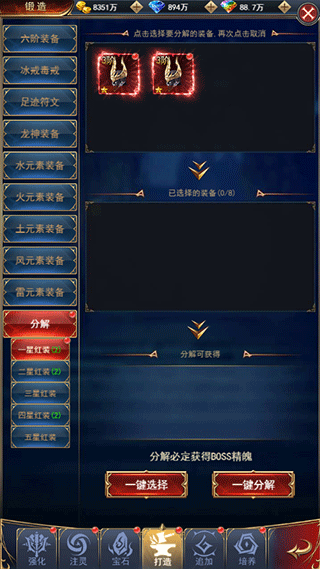 3、除了8个部件外,个别培养方式还可以多装备两件,为“红色冰戒”和“毒戒”,需要参加活动获得,或通过“打造”界面进行合成打造。此外,装备阶数的等级越高,装备培养的上限就越高,所以可好好利用打造页面,使用材料去合成一些高阶装备。此外打造还可以分解装备,获得“BOSS精魄”,可购买兑换其他物品哦。