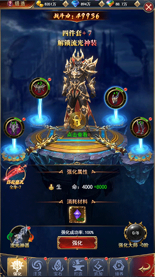 1、锻造在玩家通关秘境关卡7关开启,通过主界面点击【锻造】进入功能界面,这里主要培养的装备为“流光神器”四件套和“流光神装”四件套,即8个基础部位。共有“强化、注灵、宝石、打造、追加、培养、镶粉、增幅”8种方式来培养强化装备。