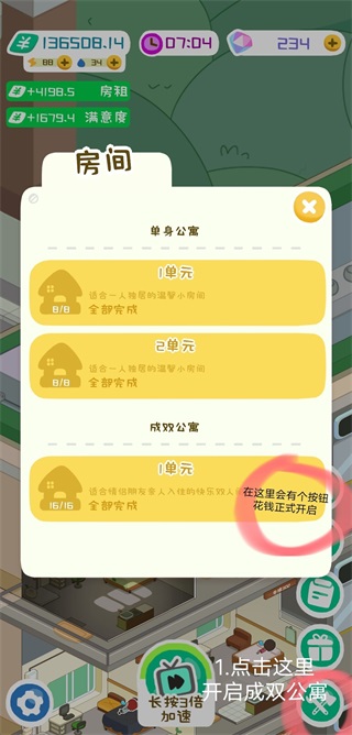 4、玩家是一名房产大亨,玩家需要将各个房屋进行出租来收获奖励;