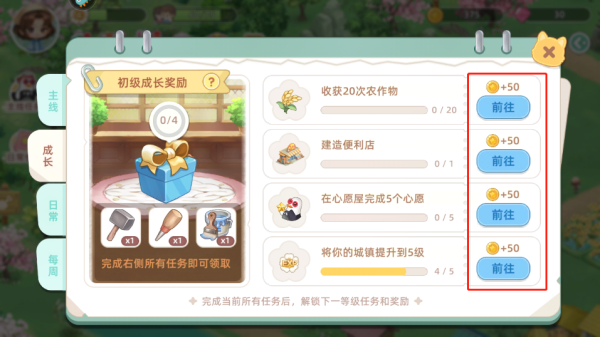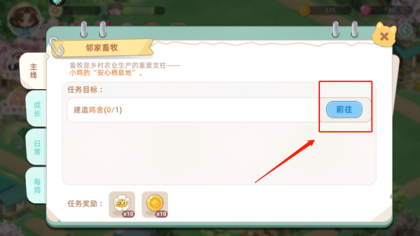 3、点击主线任务,完成用于获得奖励帮助快速升级,获取金币,如:建造鸡舍