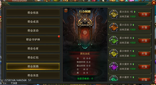 玩家还可以用贡献提升帮会图腾的等级,每个图腾提升对应属性的数值,帮会等级越高,可提升等级越高。