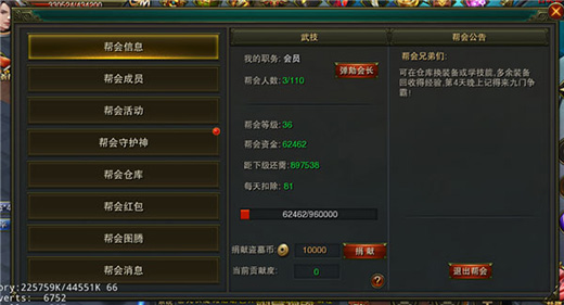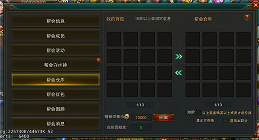 玩家可以将60级以上的装备放入帮会仓库中,获得帮会贡献度,也可以利用贡献度取出自己需求的装备!