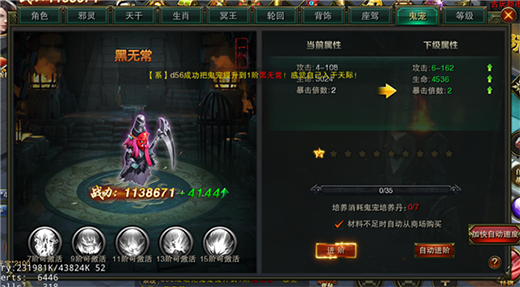 鬼宠系统,通过消耗鬼宠经验丹,提升鬼宠等级,鬼宠提升可获得大量属性加成!