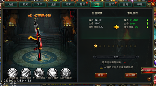 背饰系统,通过消耗羽毛,提升羽翼等级,羽翼提升可获得大量属性加成!