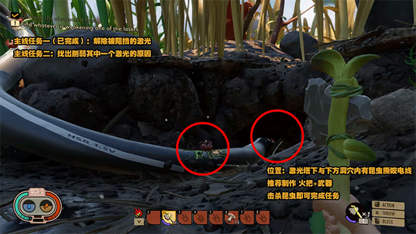 前往不稳定激光的光束塔下方击败干扰光束塔线路的昆虫